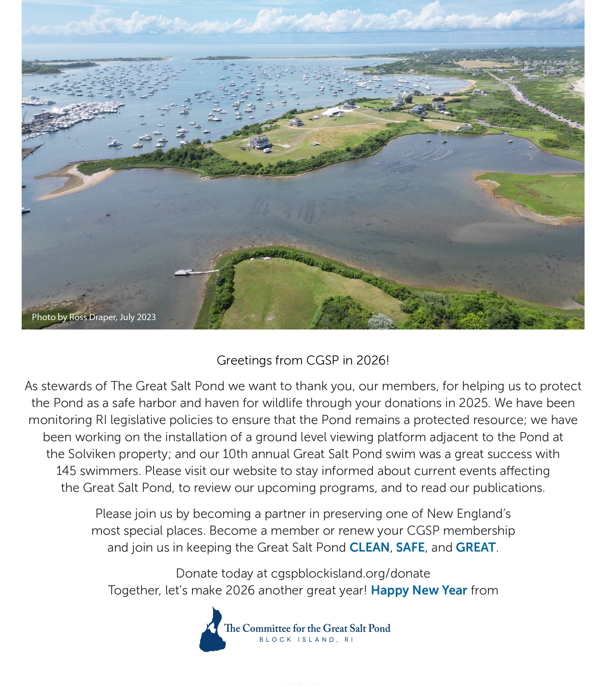 The Great Salt Pond, with its shorelines and wetlands, provides Block Island with a beautiful sheltered harbor that is a haven for recreation. The rich, diverse, and fragile ecosystem deserves protection from over-development. The Committee for the Great Salt Pond was founded in 1986 to protect this resource through education, legislation, legal defense and advocacy to balance the recreational, environmental and commercial forces on and around the pond.
